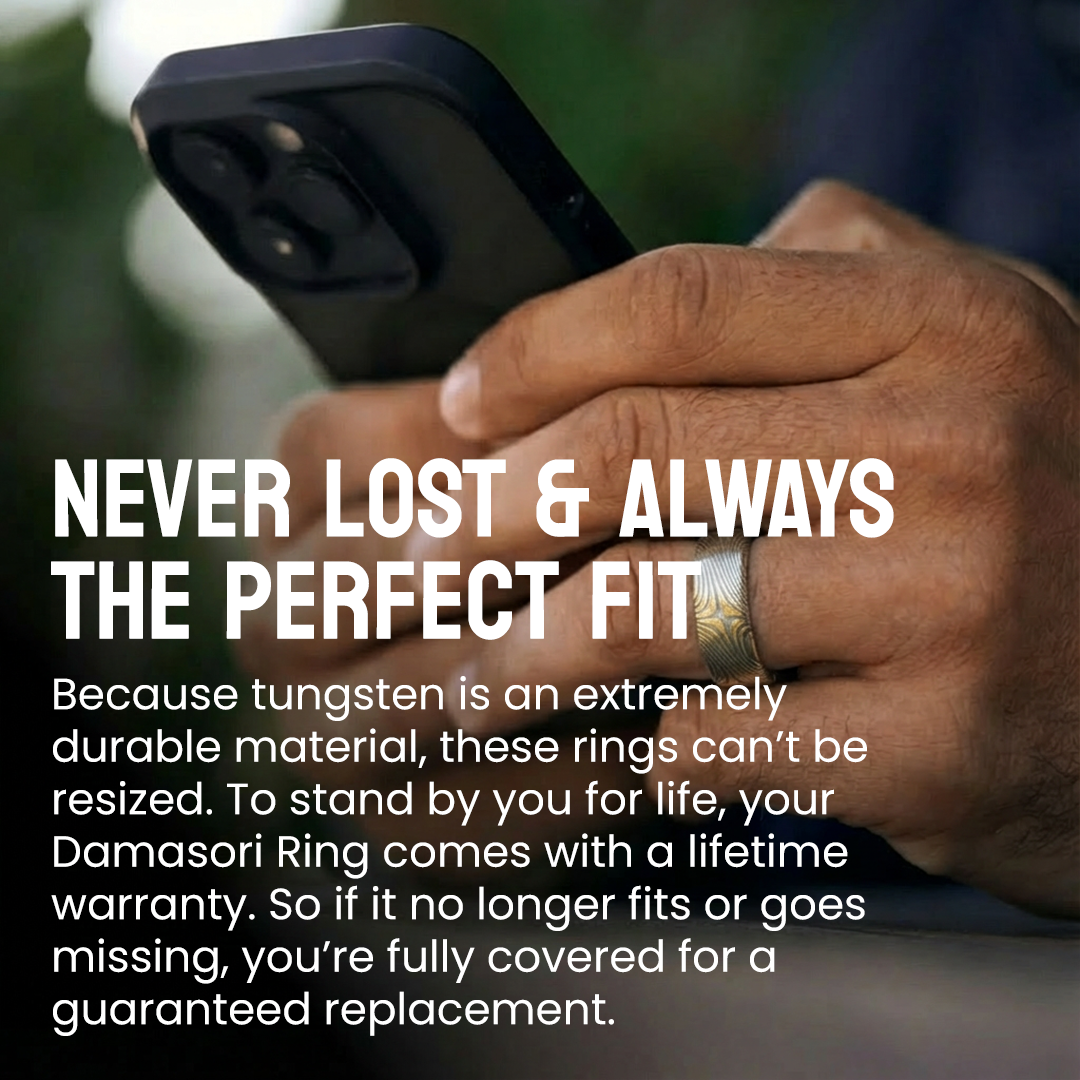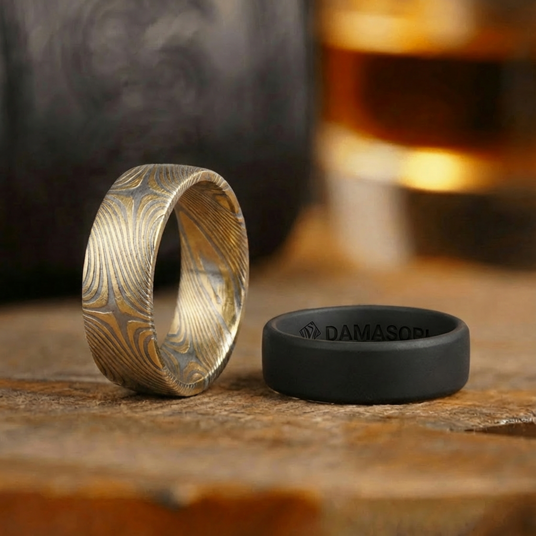 The Damasori Rings are made with durable, scratch-resistant materials like Tungsten Carbide, Carbon Fiber, Forged Carbon, and Titanium. The dual-band silicone ring is durable yet flexible. Perfect for additional comfort or an active fit.