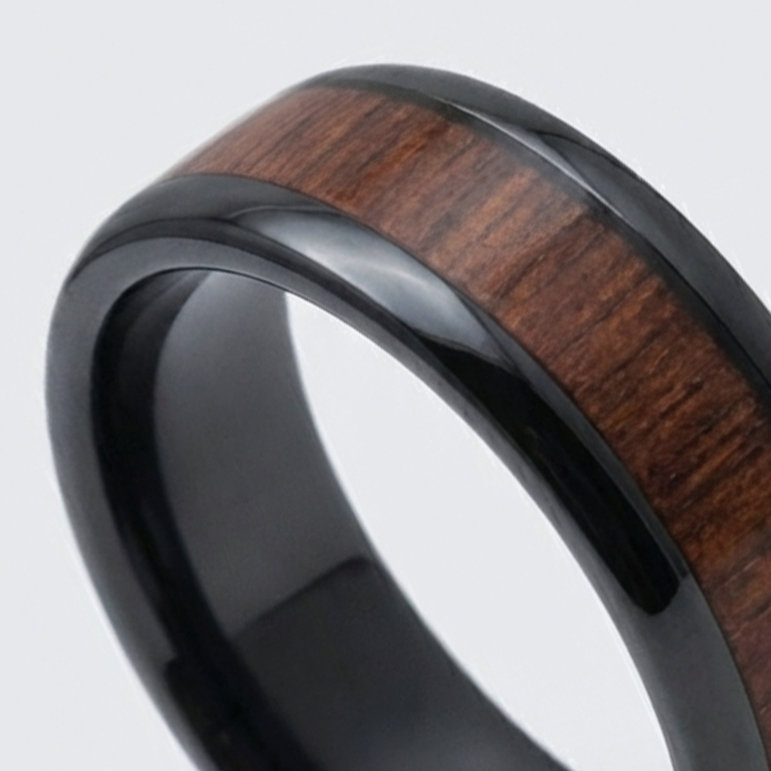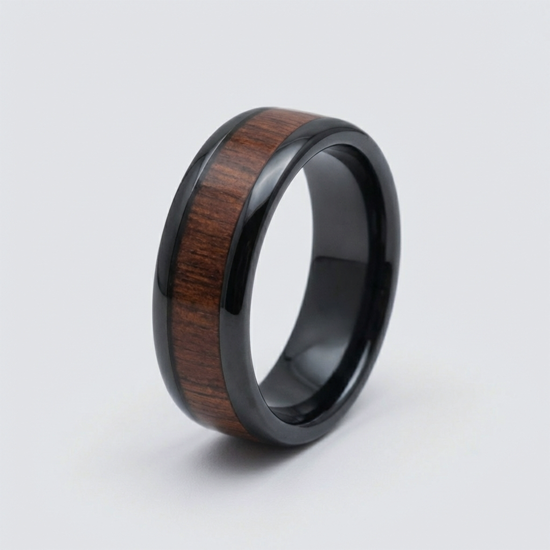 Crafted from solid tungsten carbide with a deep black finish, The Nightwood features a genuine natural wood inlay set within a bold 8MM profile — blending organic texture with a sleek, modern edge.