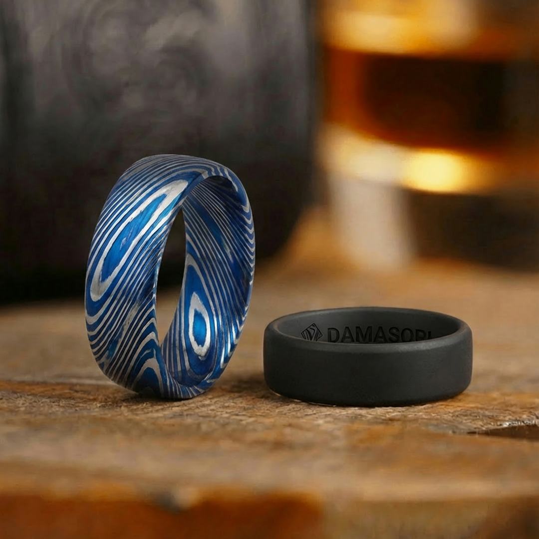 The Damasori Rings are made with durable, scratch-resistant materials like Tungsten Carbide, Carbon Fiber, Forged Carbon, and Titanium. The dual-band silicone ring is durable yet flexible. Perfect for additional comfort or an active fit.
